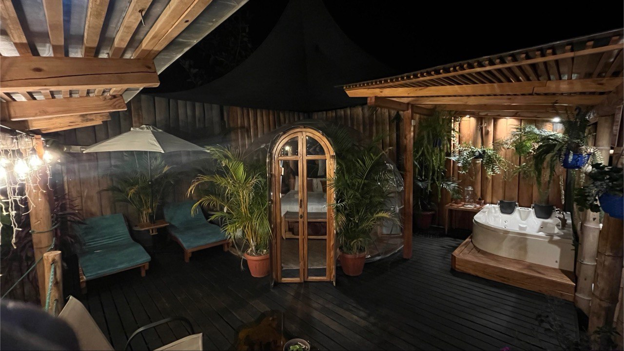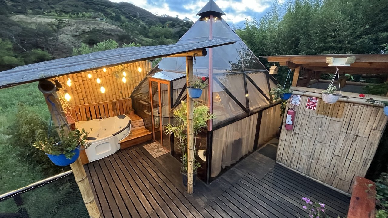 Un domo completamente transparente con vista panoramica a las montañas y al cielo para observar el atardecer, las montañas, la luna y las estrellas mientras te recuestas en las tumbonas, en la cama o te relajas en el hidromasaje con espuma y burbujas o hacer una fogata.